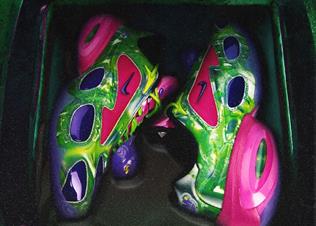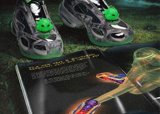 金属金与晴空红的碰撞炽热张扬,金属银与怒放绿的交织则冷峻神秘。鞋面上的变幻印花是设计的核心魔法,随着穿着者的移动而流动、变形,为整体创造出一种超现实的科幻趣味。细节处隐藏着通往WINDOWSEN元宇宙的线索。鞋带上的小小“外星人”头像可以拆卸把玩,仿佛一个来自异星的信物;鞋身印有的宇宙居民形象,暗示着一个充满生命力的平行世界;而鞋底与鞋垫上独特的二趾外星脚印,则悄然诉说着未知文明的存在。每一处均呼应WINDOWSEN “高级定制×俱乐部美学”中戏谑又犀利的矛盾感。“我喜欢在设计中埋藏密码,等懂得的人来解锁。”Sensen说,“这双球鞋就是通往未知WINDOWSEN宇宙的传送器。”