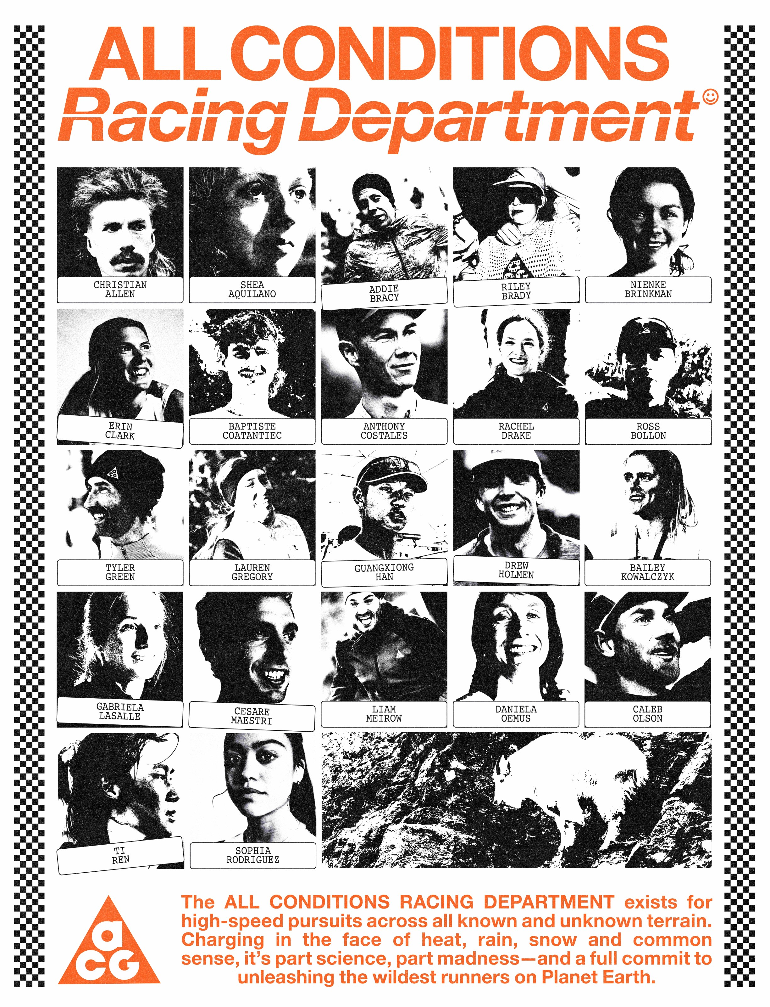 ACG对户外运动员的支持还体现在All Conditions Racing Department:一支专为追求突破、敢于挑战极限的越野跑者组成的精英队伍。本季,数位新成员加入其中,在现有22位精英运动员的队伍阵容进一步升级扩大。运动员们将继续携手ACG实测原型产品、提供反馈,用不断突破运动极限的方式,助力ACG开创越野装备性能的新未来。
